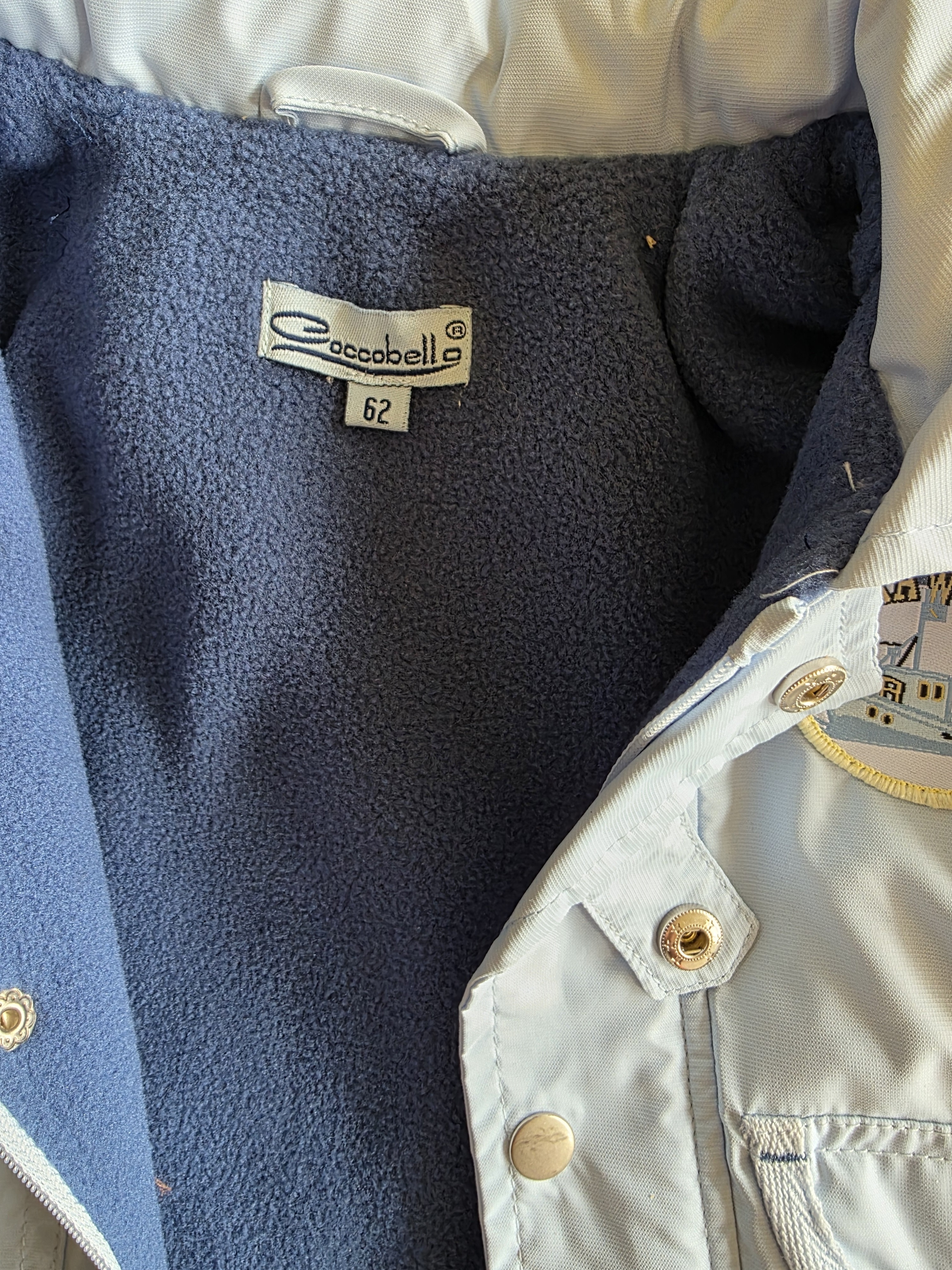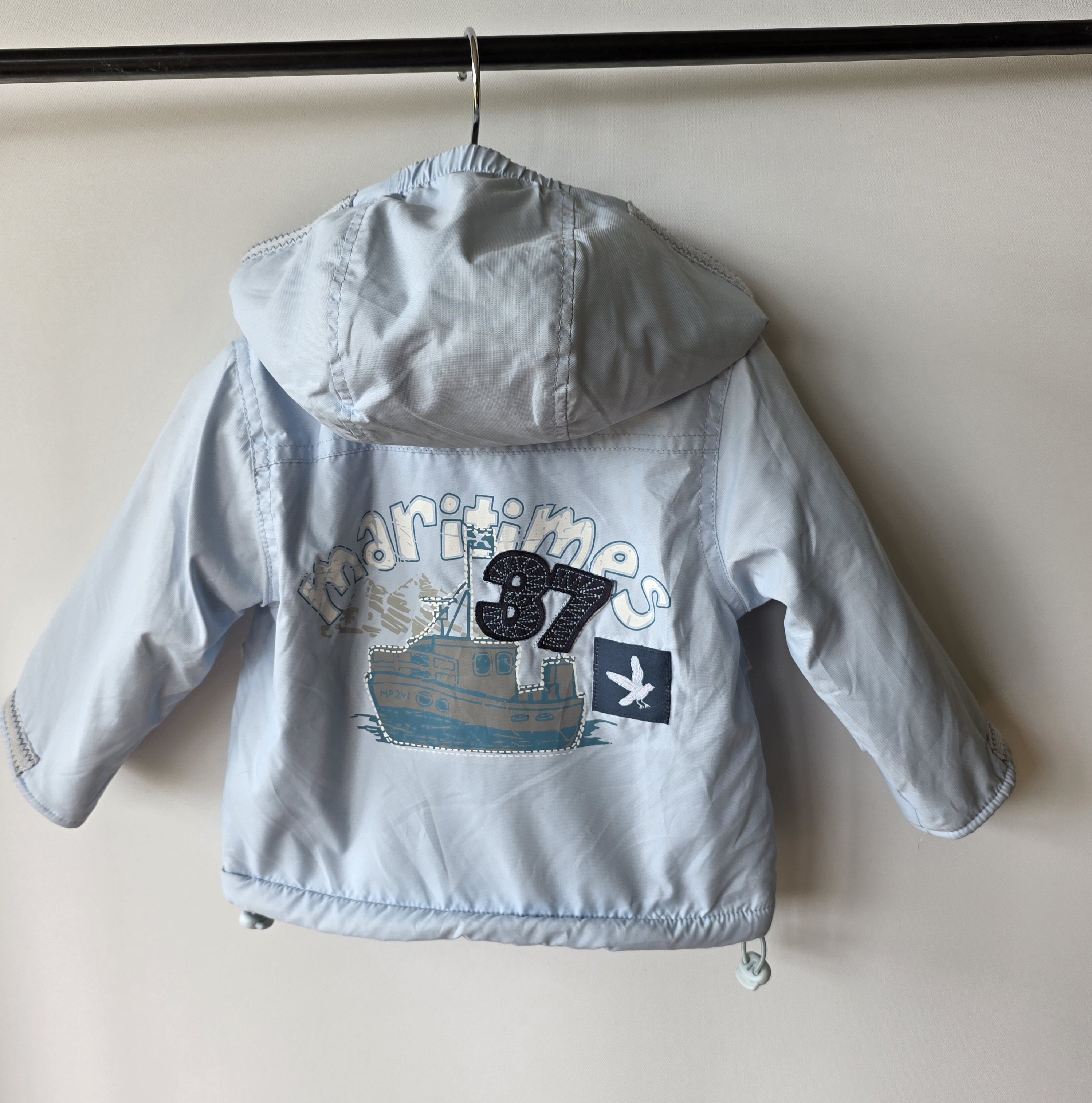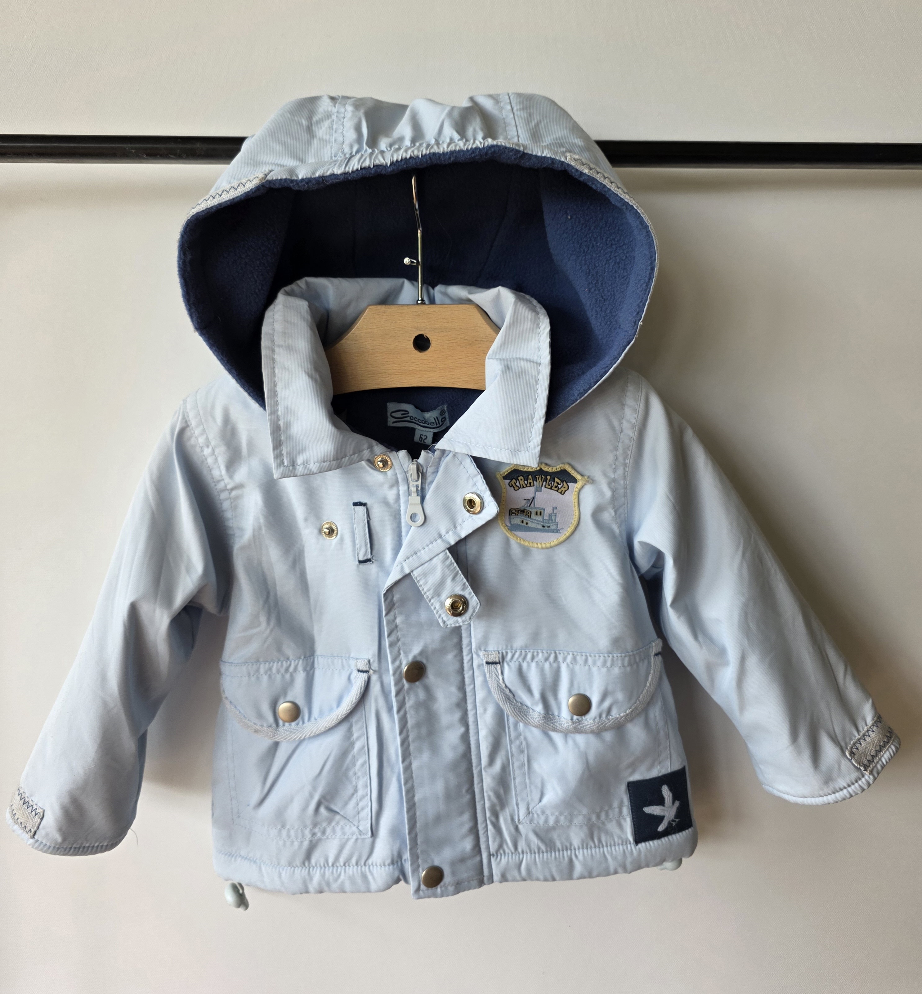 Kurtka niebieska z odpinanym kapturem na granatowym polarze.