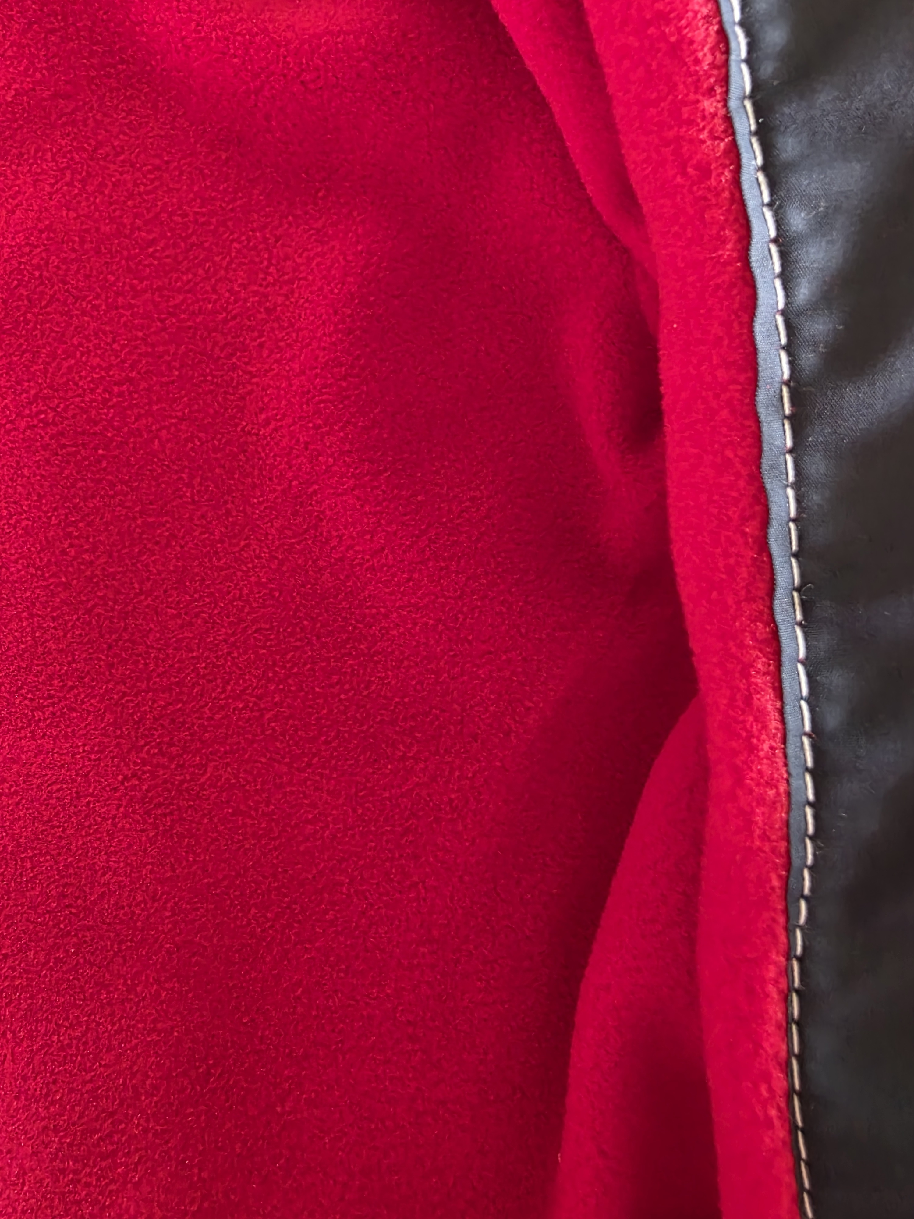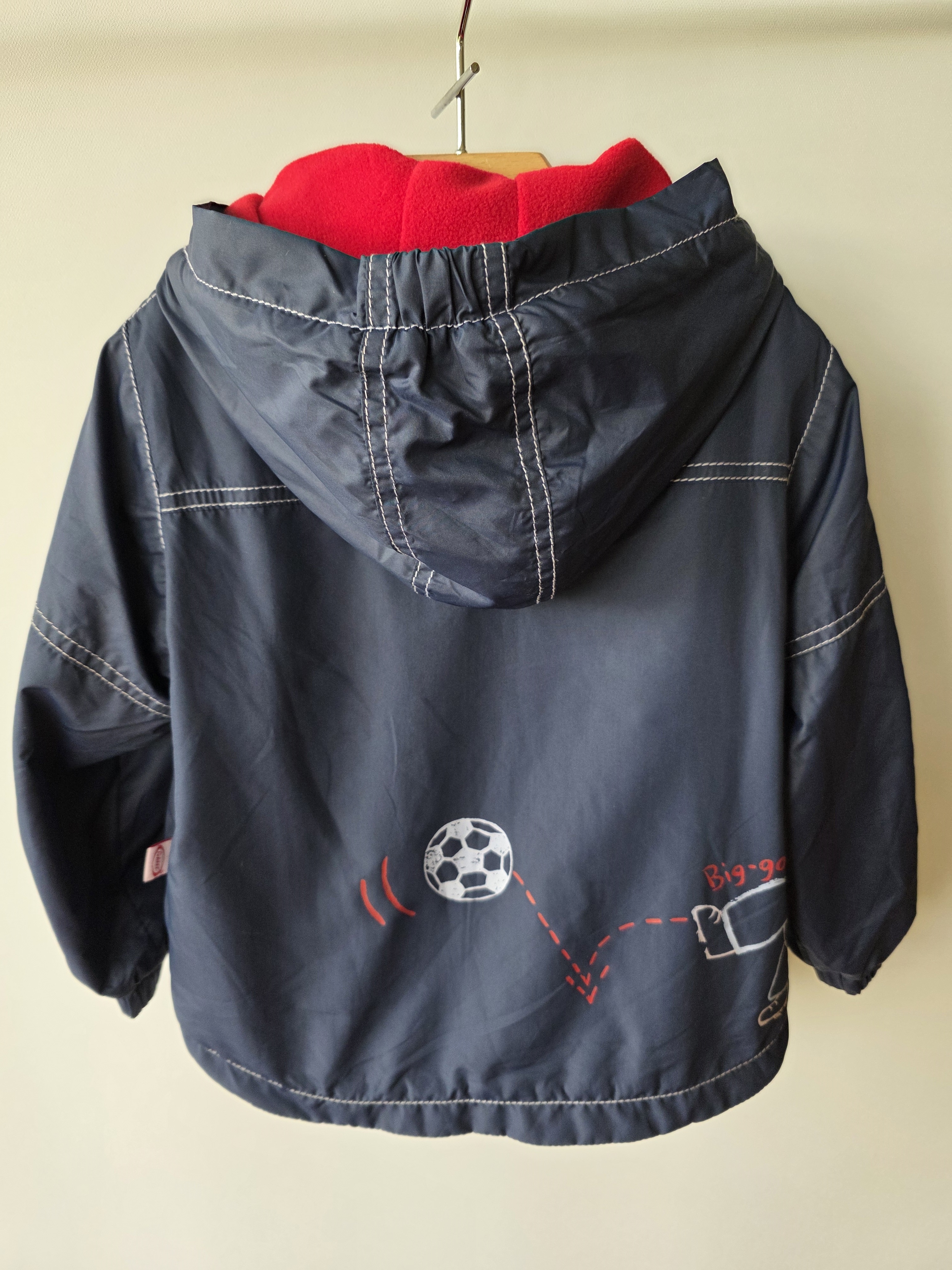Kurtka granatowa z kapturem na czerwonym polarze z czerwonymi dodatkami.