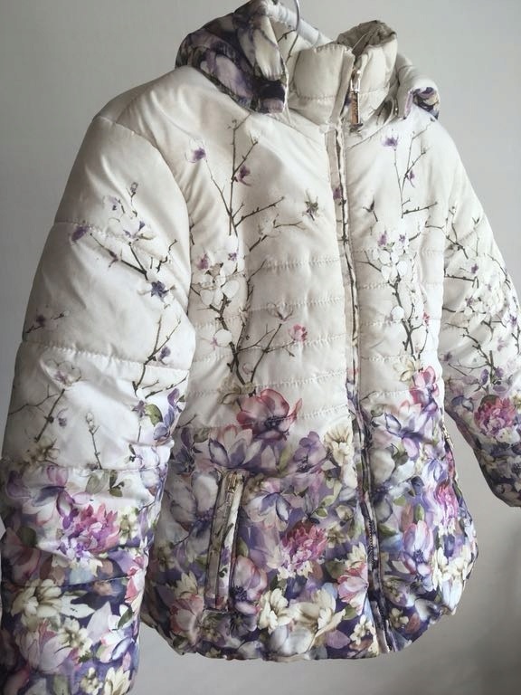 Urocza kurteczka jesienno - zimowa dla dziewczynki z kwiatowym printem i kapturem. Pikowana, puchowa.