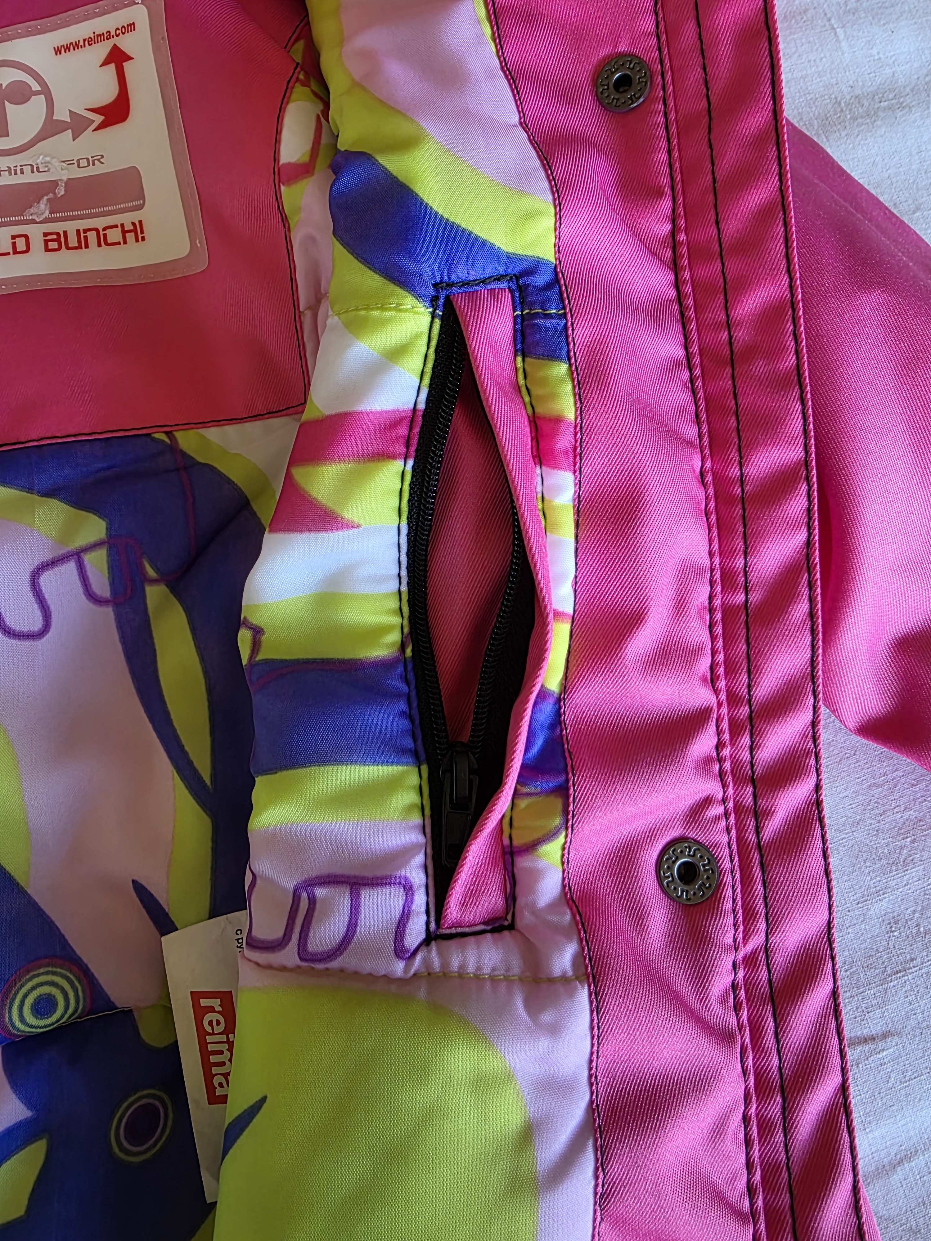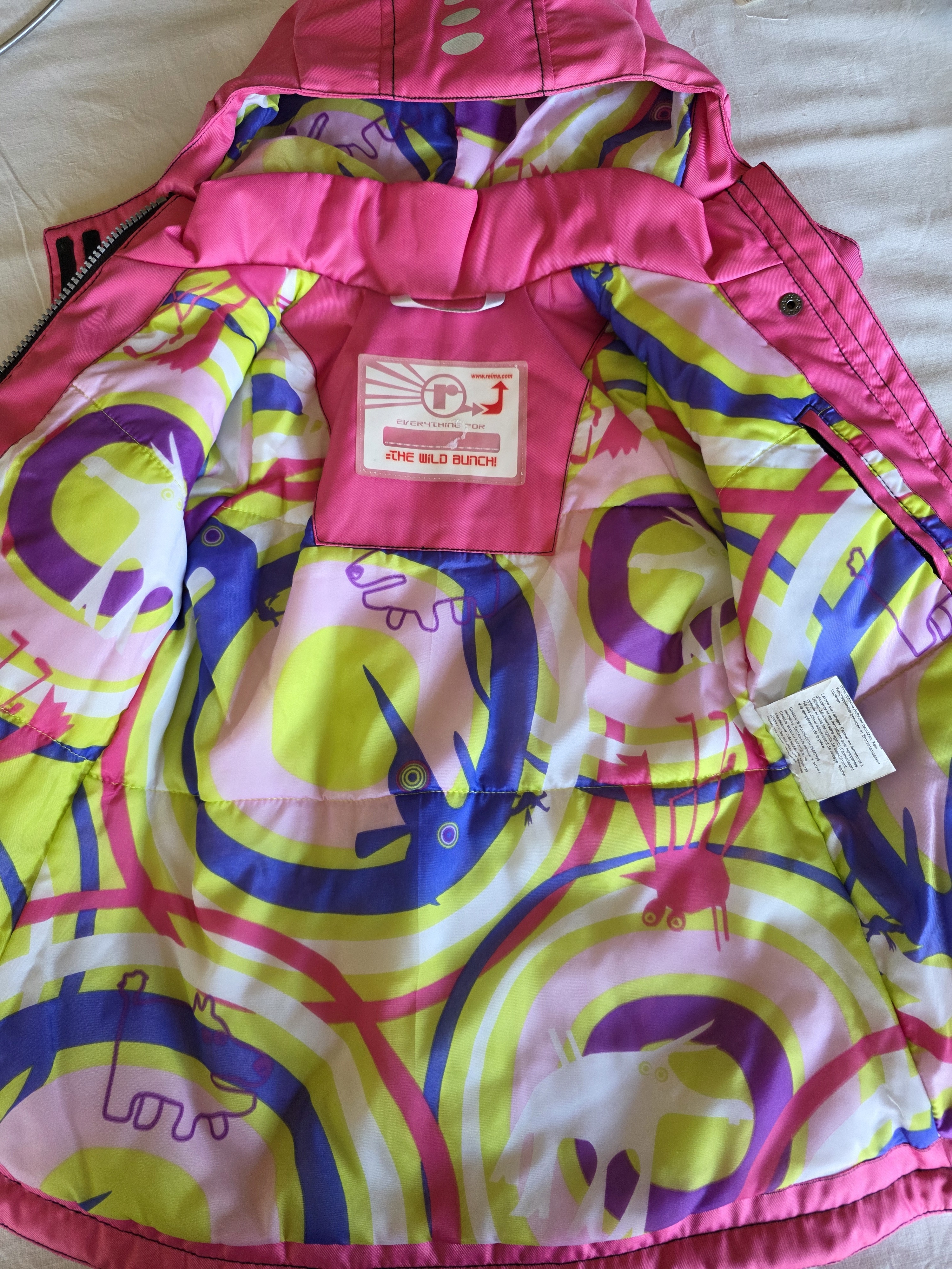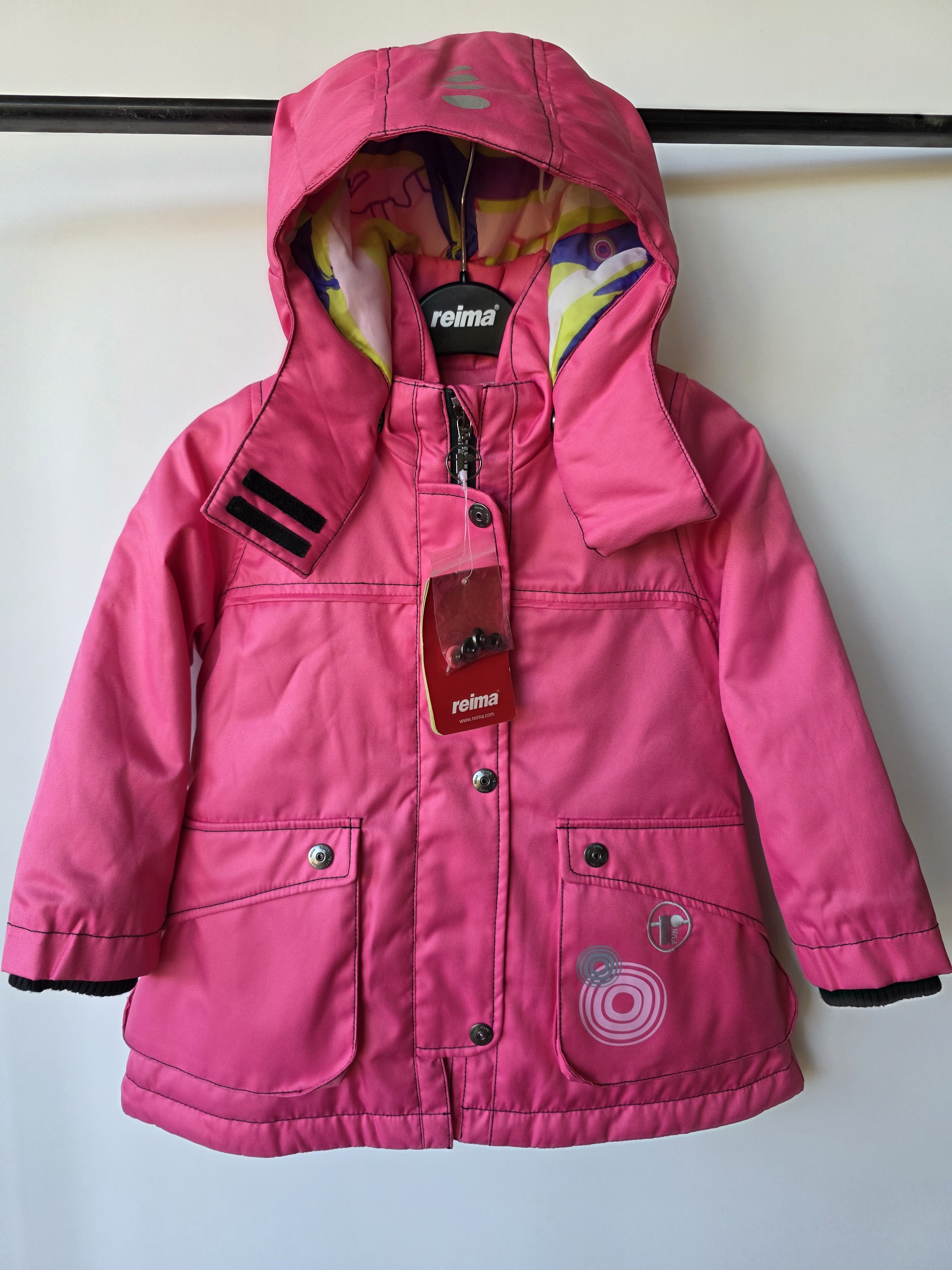 Reima, dziecięca ocieplona kurtka w kolorze różowym. Podszewka wielokolorowa. Kurtka jest ciepła i wygodna. Ponadto gęsta powierzchnia jest wiatroszczelna i wodoodporna. Zastosowane materiały są trwałe, odporne na zużycie.