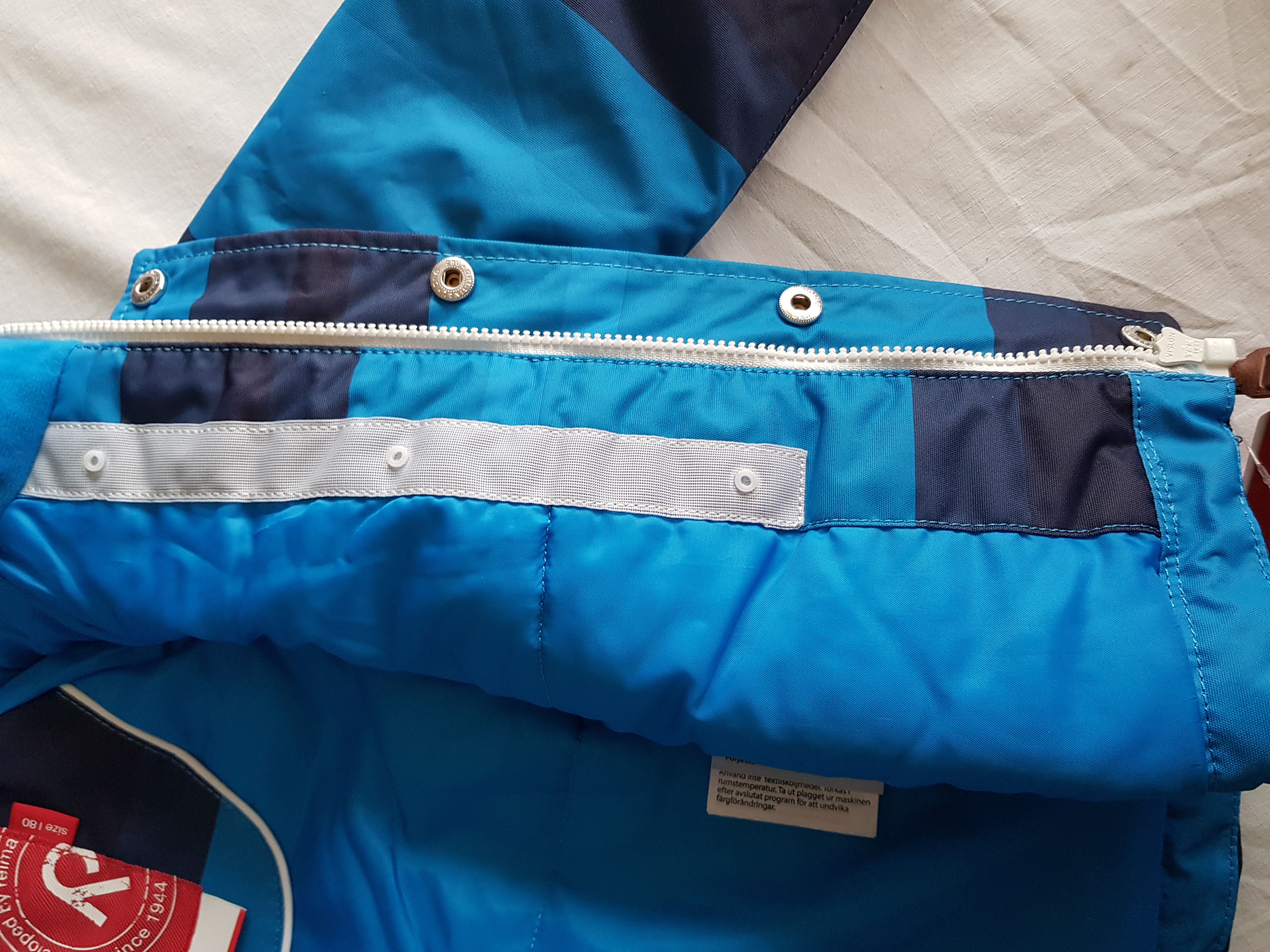 Komplet ma gładką poliestrową podszewkę i elementy odblaskowe.