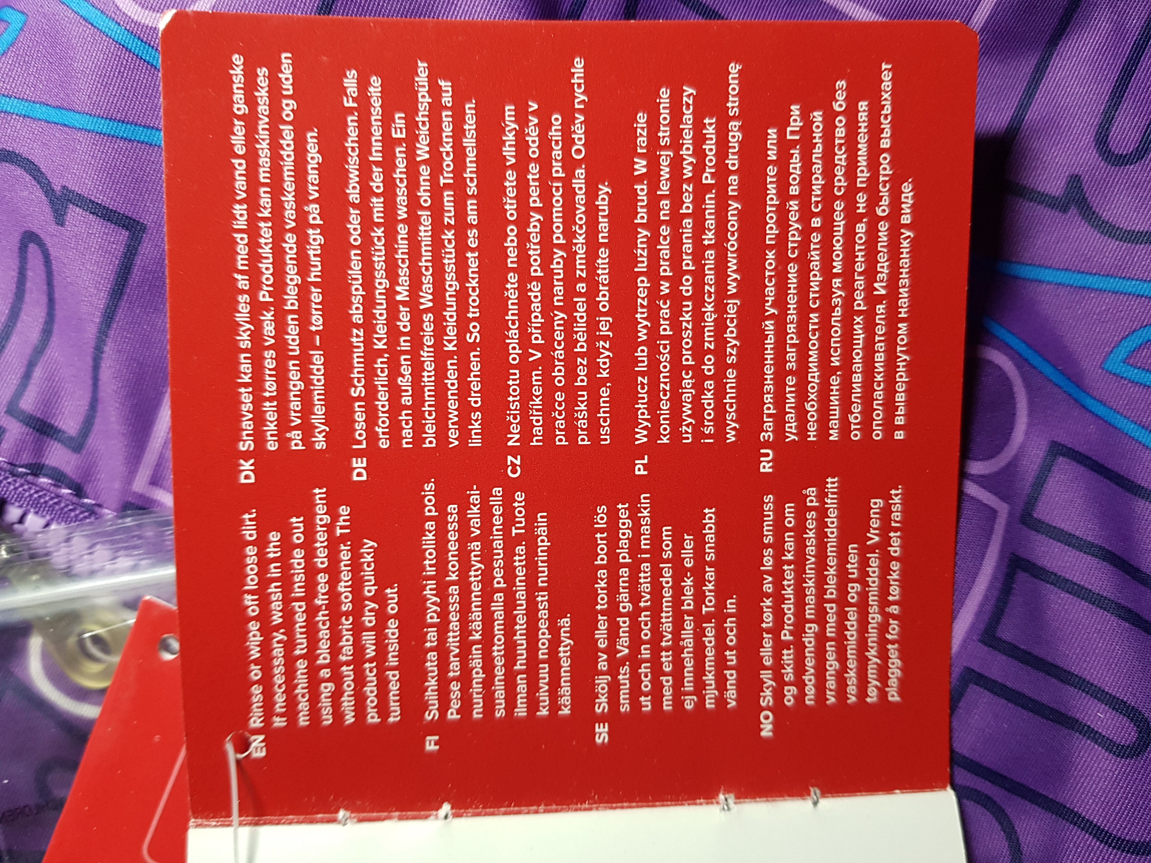 Prać oddzielnie, na lewej stronie. Zapnij zamki błyskawiczne i rzepy. Prać w detergencie nie zawierającym wybielacza. Płukać bez użycia specjalnych produktów. Aby uniknąć zmiany koloru, odzież należy wyjąć z pralki natychmiast po zakończeniu prania.