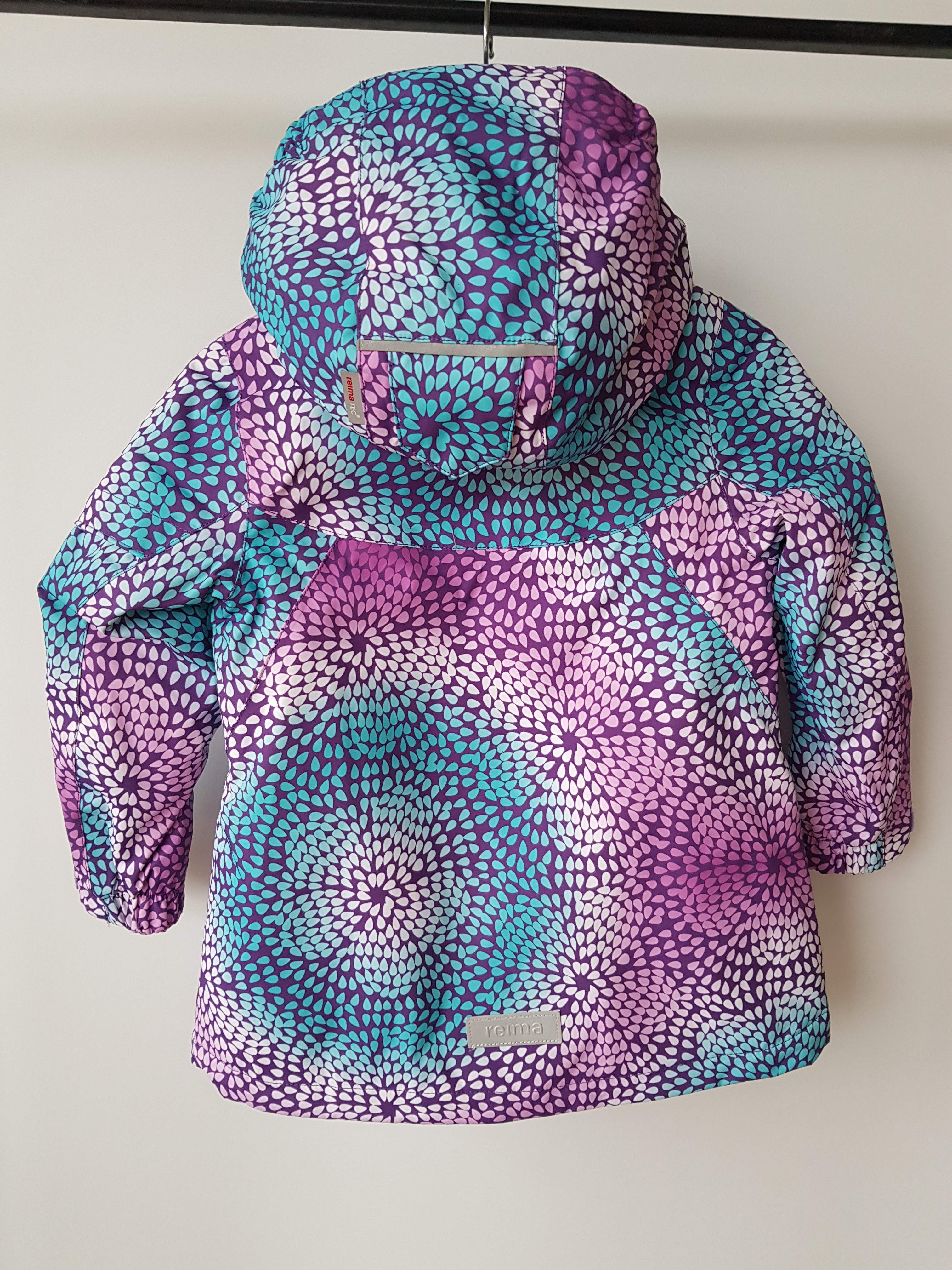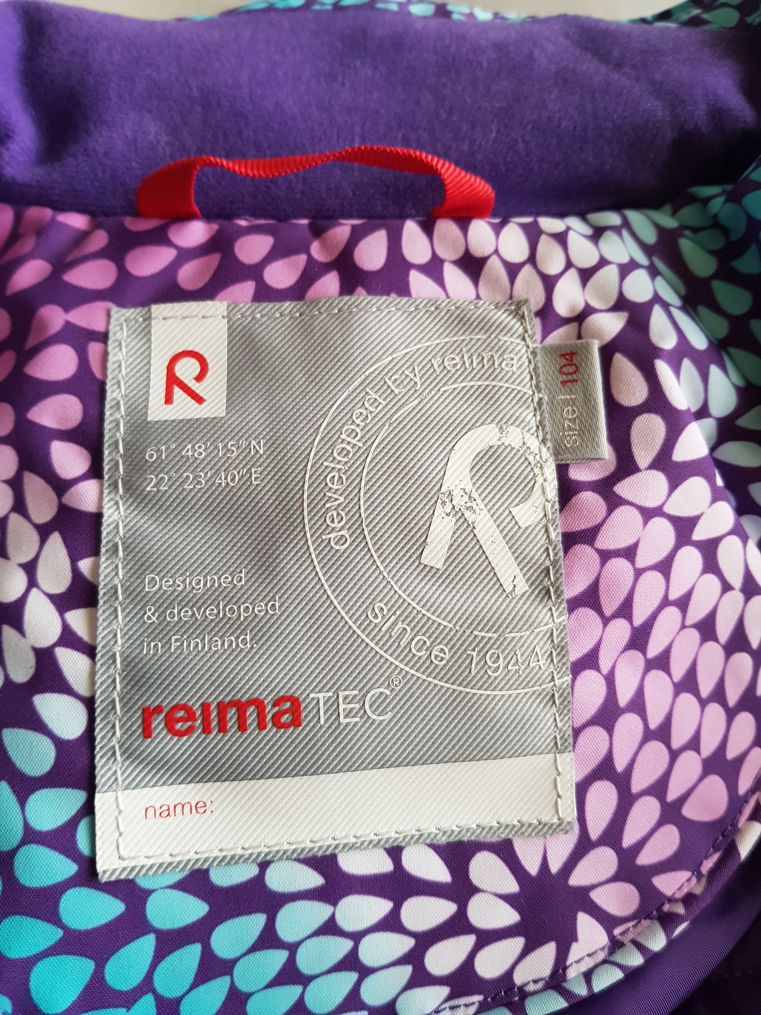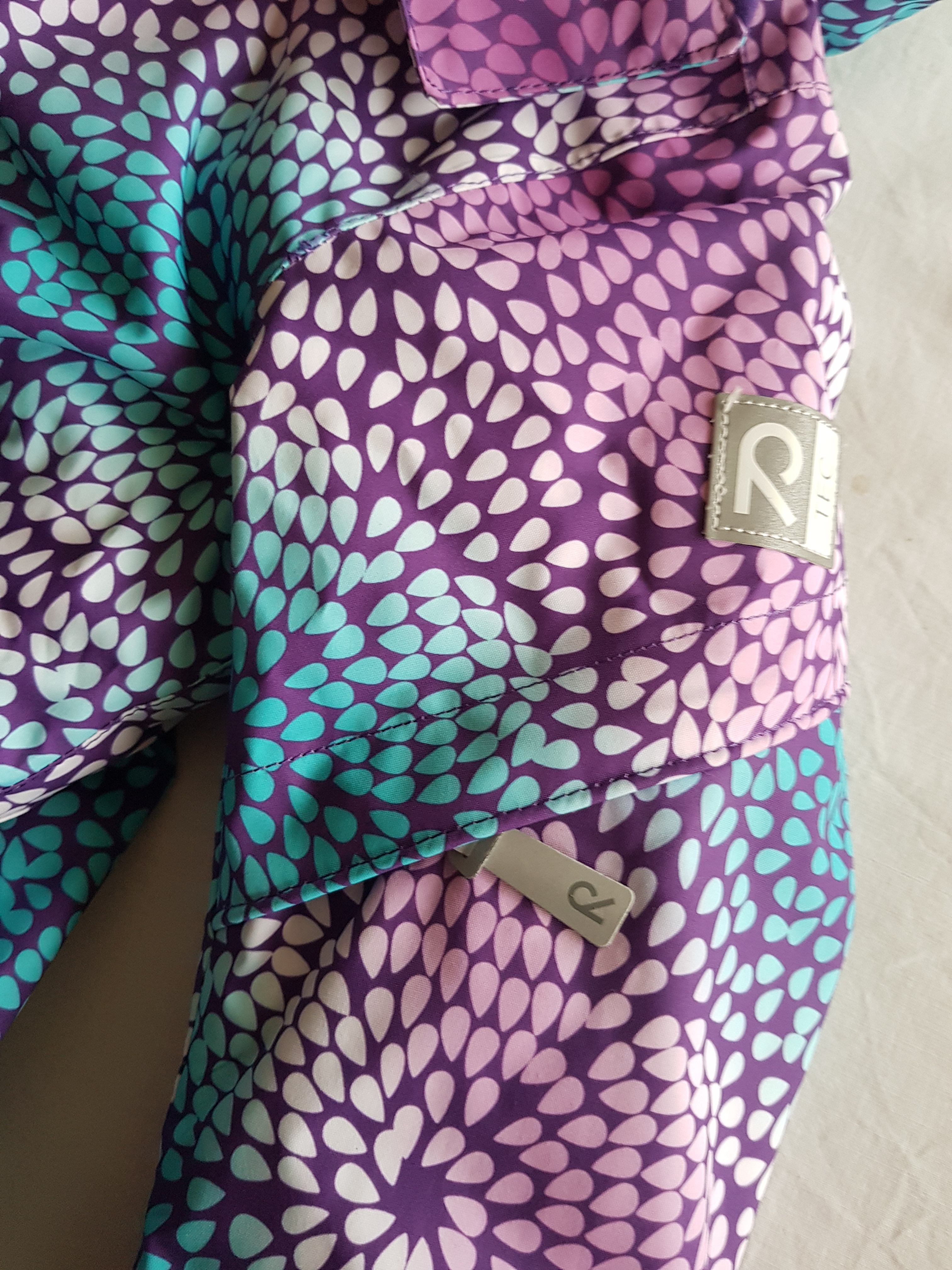 Kurtka Reimatec Relay 521424. Dziewczęcy fason, przedłużany krój. Kolor: 5911 - fioletowa / turkusowa w stylizowany wzór. Materiał zewnętrzny ReimaTec 2195: 100% PES, membrana 100% PU. Wodoodporność > 15 000 mm. Oddychalność > 5 000 g/m2/24 Odporność na ścierania: 35 000 cykli. Izolacja: 160g Elementy odblaskowe Można suszyć w suszarce bębnowej Podklejone szwy