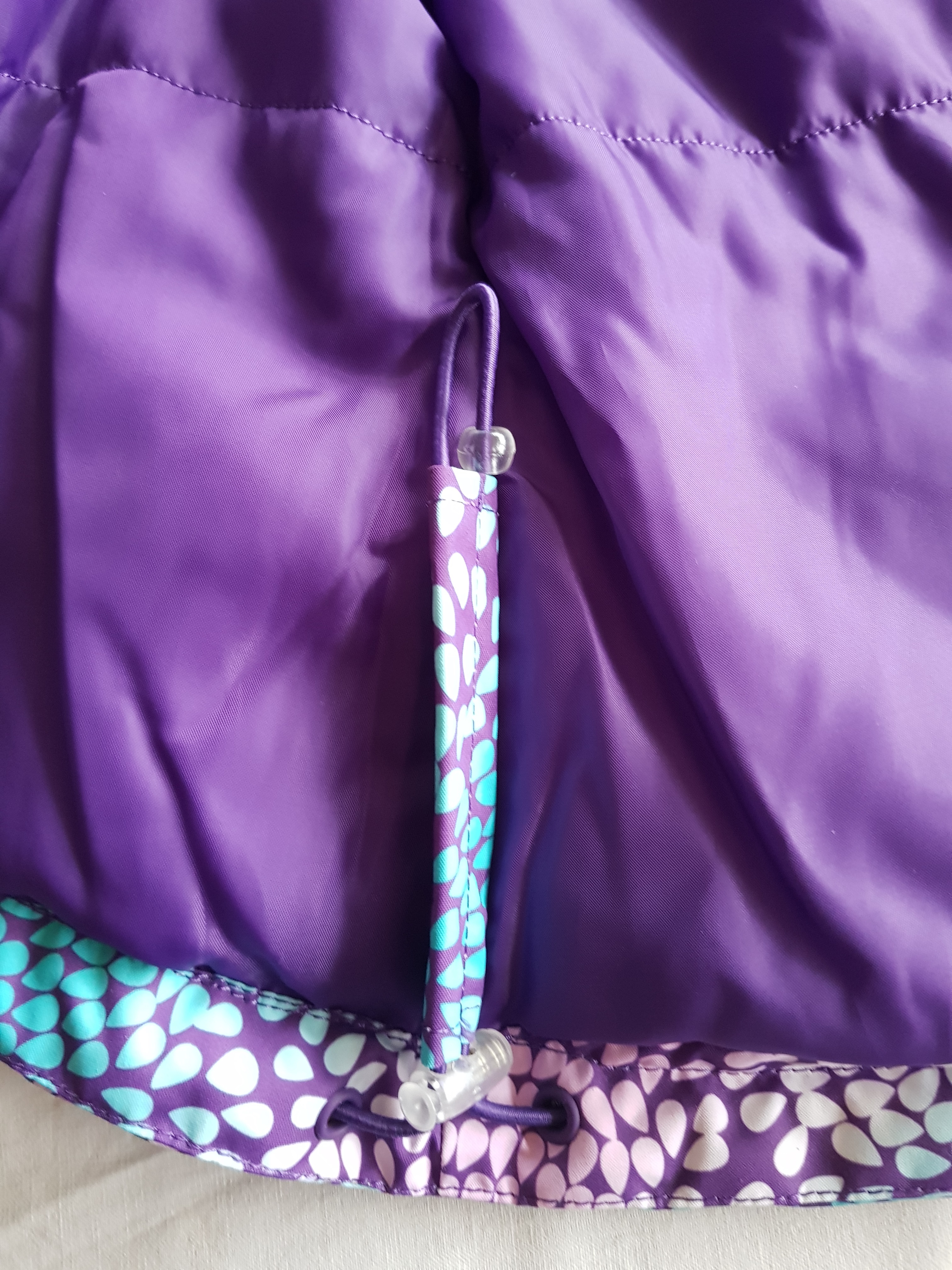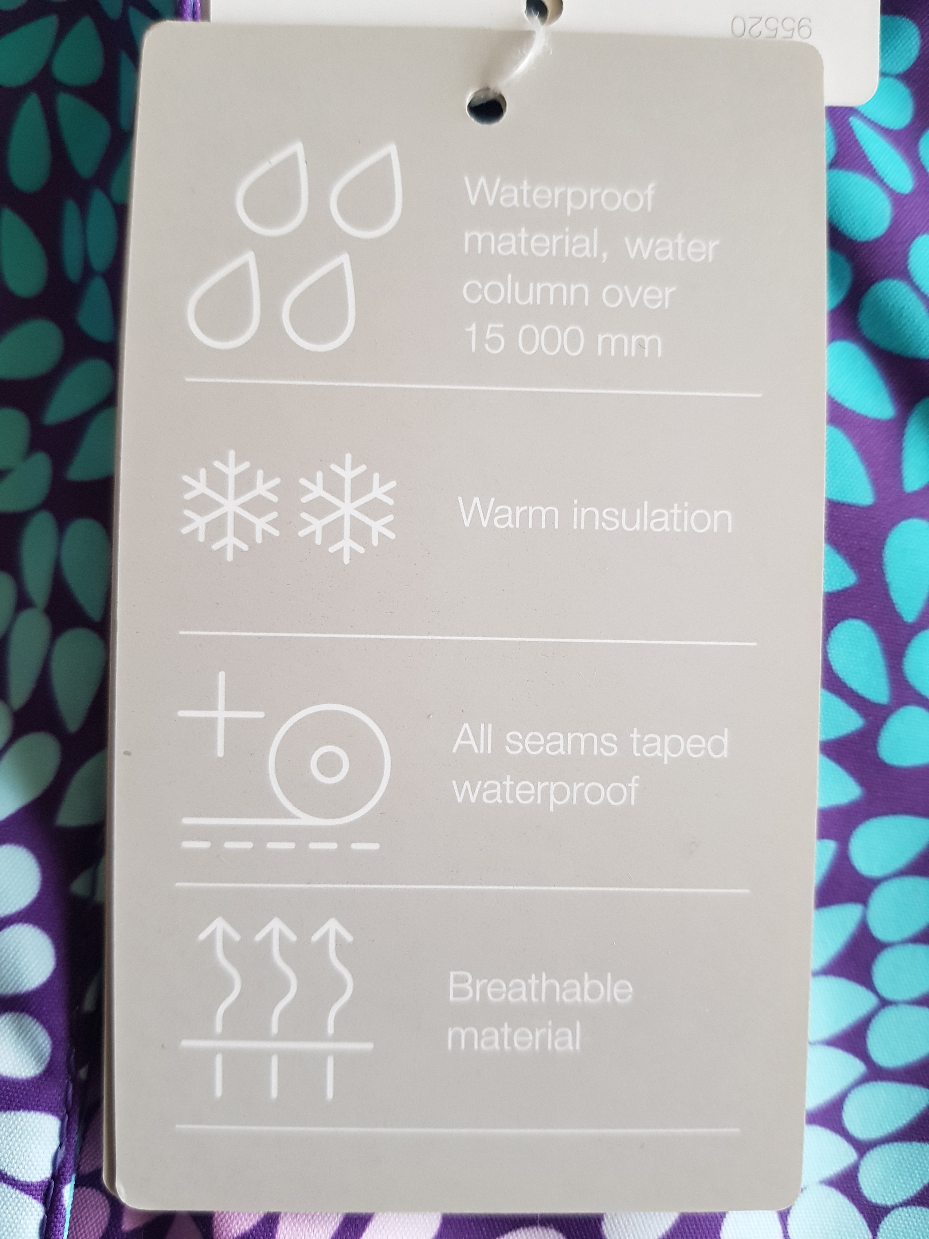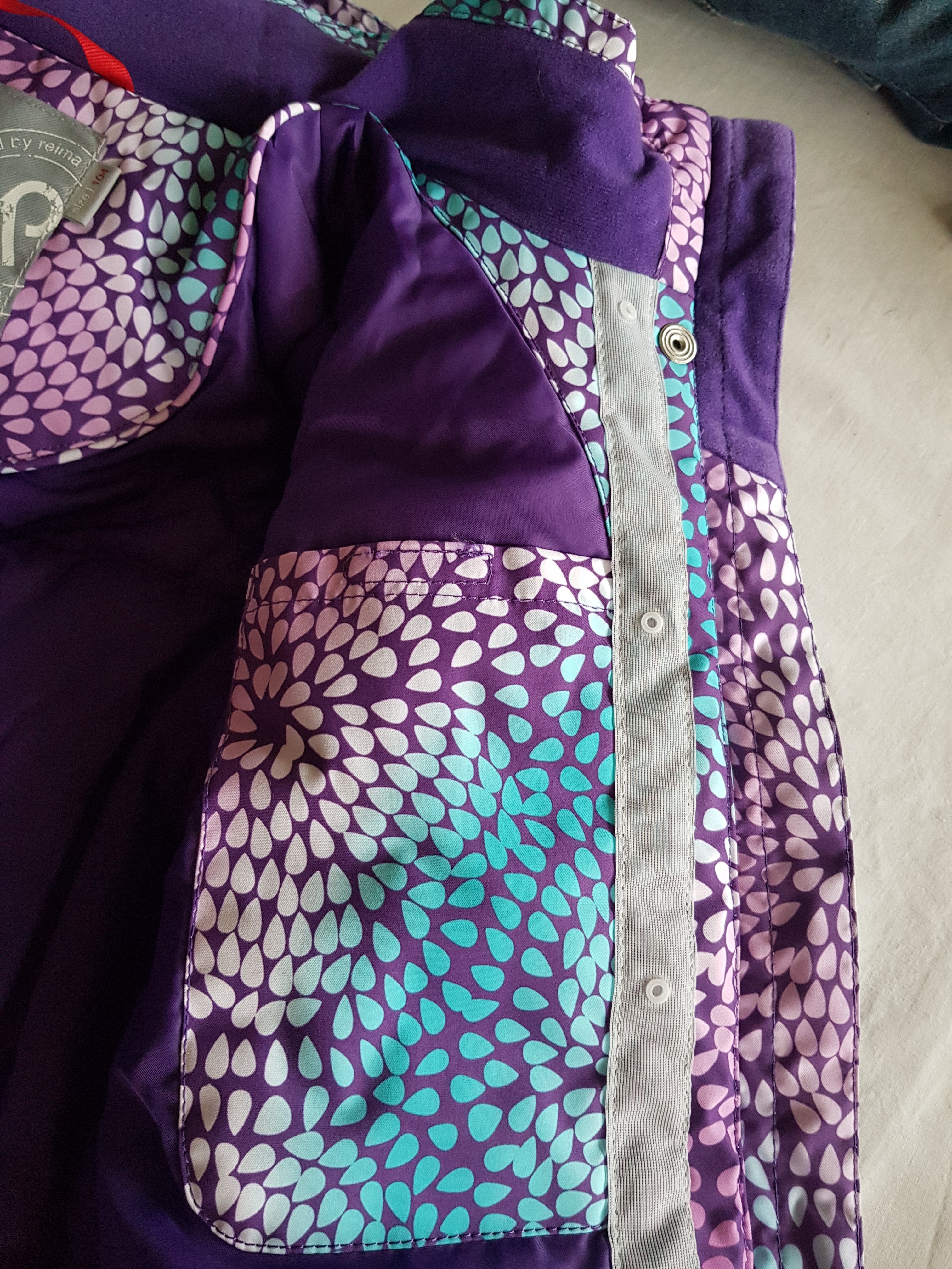 Kurtka Reimatec Relay 521424. Dziewczęcy fason, przedłużany krój. Kolor: 5911 - fioletowa / turkusowa w stylizowany wzór. Materiał zewnętrzny ReimaTec 2195: 100% PES, membrana 100% PU. Wodoodporność > 15 000 mm. Oddychalność > 5 000 g/m2/24 Odporność na ścierania: 35 000 cykli. Izolacja: 160g Elementy odblaskowe Można suszyć w suszarce bębnowej Podklejone szwy